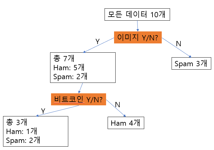 각 속성의 값을 기준으로 학습데이터를 나눠보고, 그 분류 안에서 Spam과 Ham이 어느 정도 분리가 되었는지를 평가해서, 가장 분류가 잘 된 것을 기준으로 나누면 될 것입니다.